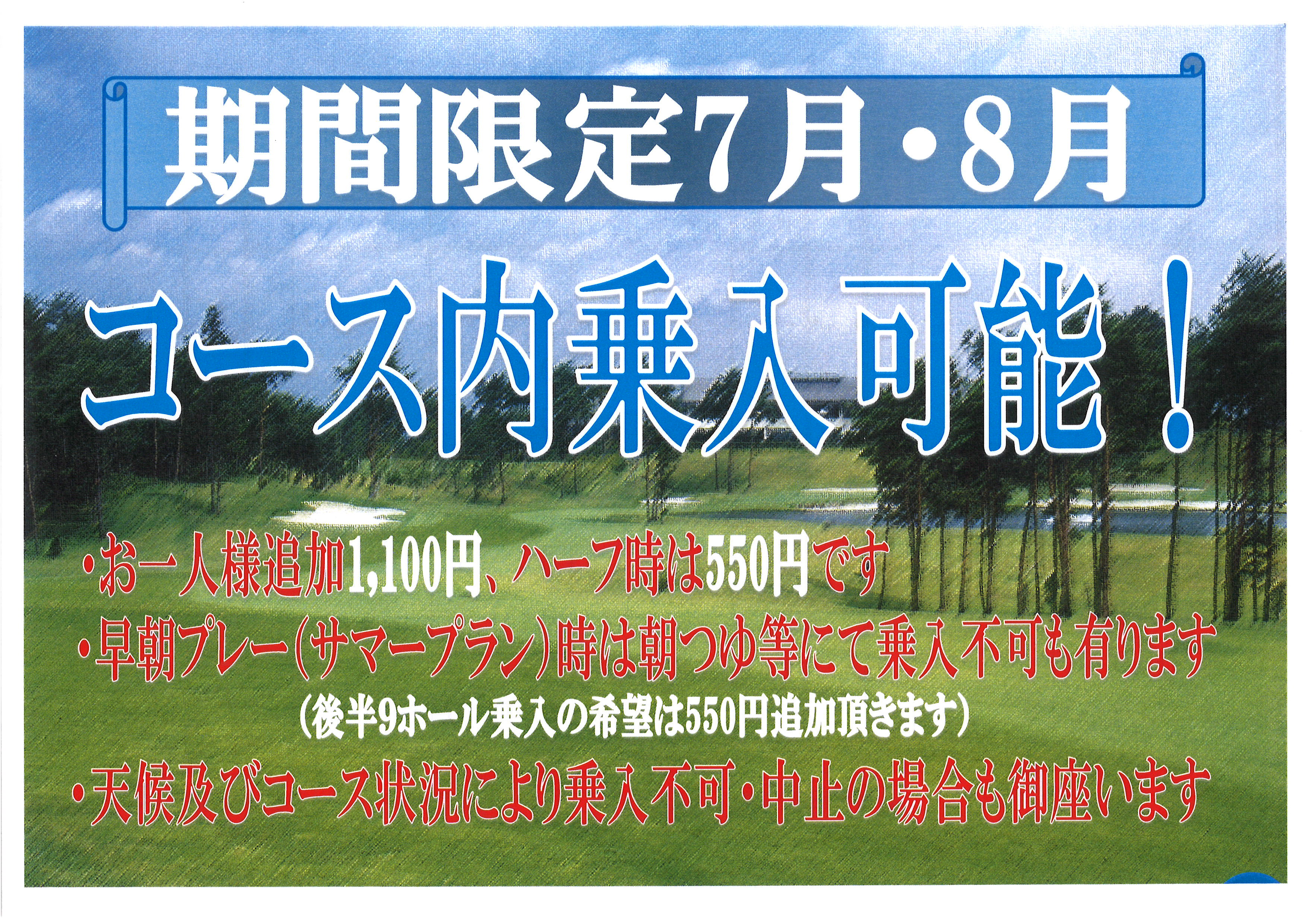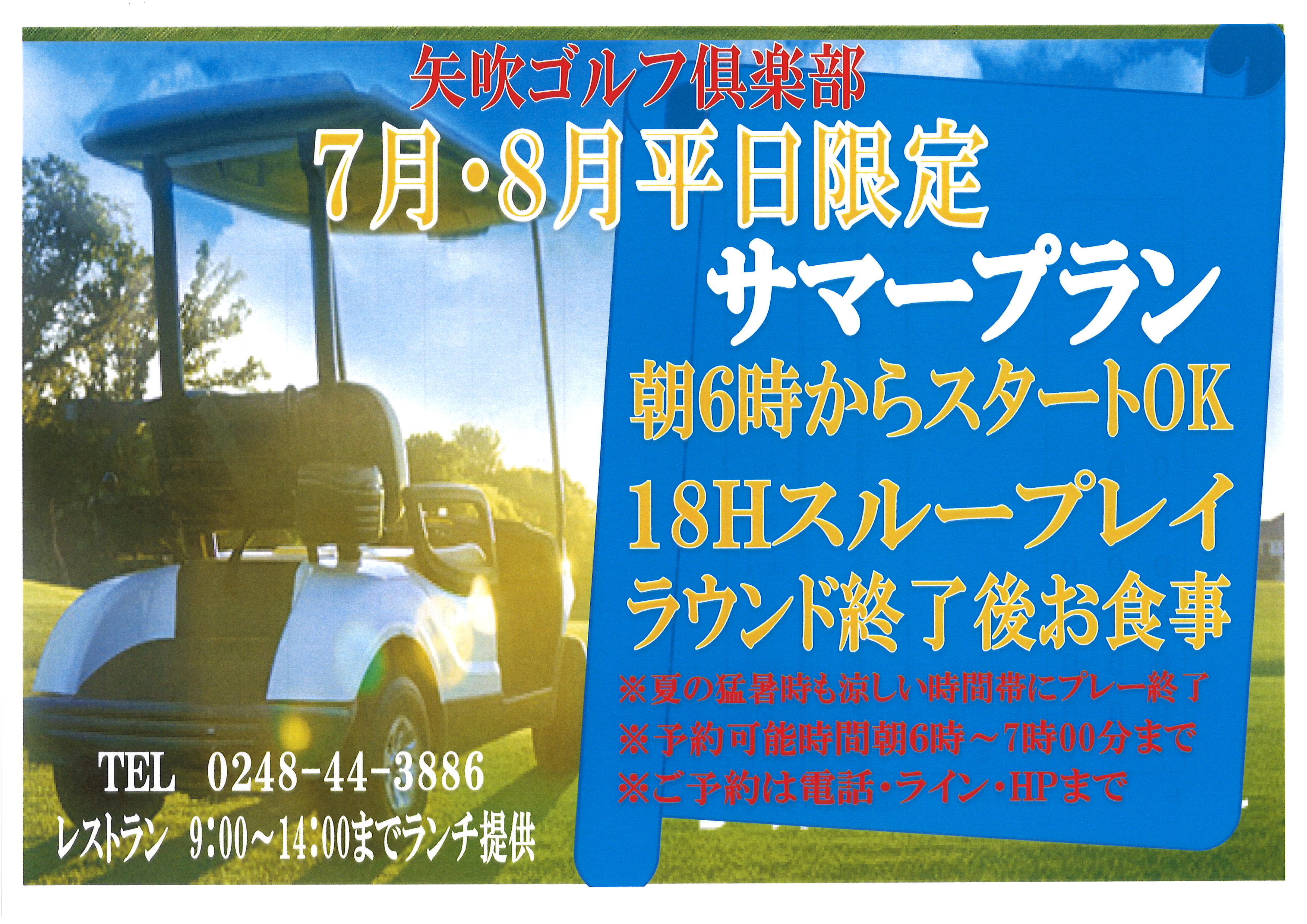 7月・8月限定で今年度もサマープランを行います朝6時~7時までスループレーにて終了後食事になりますまた今年度から猛暑対策としてコース内乗入を行います